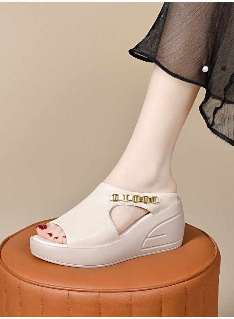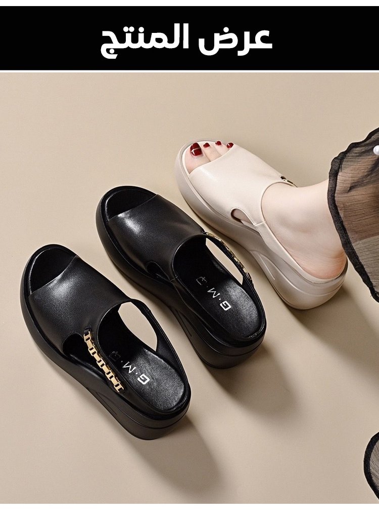 صندل نسائي بكعب سميك 8 سم مصنوع من الجلد الطبيعي مع سلسلة معدنية